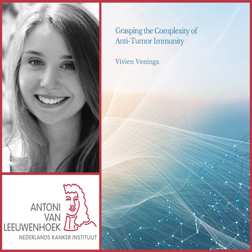 Onderzoeker Vivien Veninga: “Bij immuuntherapie wordt het afweersysteem ingezet om tumorcellen te herkennen en op te ruimen. Voor sommige kankervormen zien we dat deze therapieën, zoals checkpointremmers, tot een geweldige respons op de behandeling leiden. Het probleem is echter dat slechts een fractie van de patiënten op de beschikbare behandelingen reageert. Daarom is een beter begrip van de onderliggende cellulaire mechanismen van cruciaal belang. Een van de uitdagingen is het bestuderen van het gedrag van twee unieke entiteiten: de tumor en het afweersysteem. In mijn promotieonderzoek heb ik gepersonaliseerde modelsystemen gebruikt om de wisselwerking tussen antitumorale immuunreacties vast te leggen. In meerdere projecten keek ik naar verschillende soorten immuuncellen. Zo kreeg ik steeds meer inzicht in de complexiteit van het afweersysteem, dat werkelijk prachtig is. De omgeving van het Antoni van Leeuwenhoek stimuleerde niet alleen mijn wetenschappelijke nieuwsgierigheid, ook raakte ik persoonlijke gefascineerd door het vertalen van onderzoeksresultaten naar de echte wereld. Samen met de Entrepreneur Club organiseerde ik evenementen om andere promovendi en Postdocs te stimuleren om verder te kijken dan ons dagelijkse laboratoriumwerk en na te denken over hoe we een grotere impact kunnen creëren. Ik geloof dat het een zeer opwindende tijd is voor de biotechindustrie en ik kan niet wachten om er zelf meer bij betrokken te raken.”