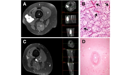 Figuur A laat een MRI scan zien van een been van een patiënt met een myxoid liposarcoom voorafgaande aan de behandeling. Nummer 1 is het sarcoom zelf, de nummers 2 zijn de normale spieren van het bovenbeen, nummer 3 is het normale onderhuidse vetweefsel en nummer 4 is het dijbeenbot (femur). Daarnaast staan nog 3 MRI plaatjes (de bovenste is een verkleinde weergave van het grote plaatje; middelste tumor in voor-achterwaartse aanzicht en het onderste plaatje beeldt de tumor af in een zijaanzicht)