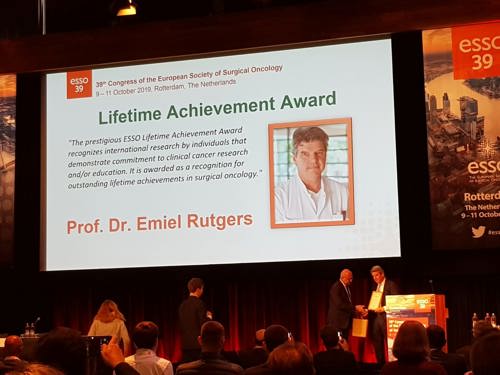 Borstkankerchirurg Emiel Rutgers heeft tijdens het 39e congres van de European Society of Surgical Oncology (ESSO) een Lifetime Achievement Award uitgereikt gekregen voor zijn inzet en grote bijdrage aan het klinisch onderzoek naar en de verbetering van de kwaliteit van borstkankerchirurgie.