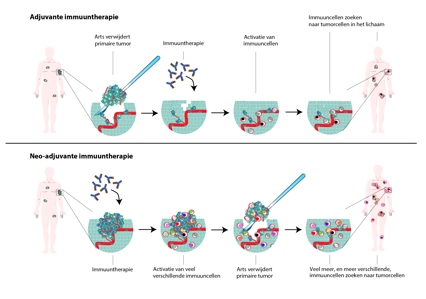 Oncoloog en onderzoeker Christian Blank van het Antoni van Leeuwenhoek richt zijn pijlen op een nieuwe aanpak: immuuntherapie voorafgaand aan de operatie in plaats van erna, zoals nu het geval is (zie illustratie). Zo'n neo-adjuvante behandeling zou veel voordelen kunnen hebben. "Je kunt goed zien of een patiënt reageert op een bepaald middel of niet, doordat je in de daarna verwijderde tumor kunt zien of de kankercellen dood zijn gegaan", zegt Blank. "De verwachting is bovendien dat de immuunreactie breder en daardoor beter zal zijn. Als de tumor nog in het lichaam aanwezig is, kan het immuunsysteem de hele tumor met al zijn variaties leren herkennen. Ook is de tumor na effectieve immuuntherapie kleiner en mogelijk makkelijker te opereren."