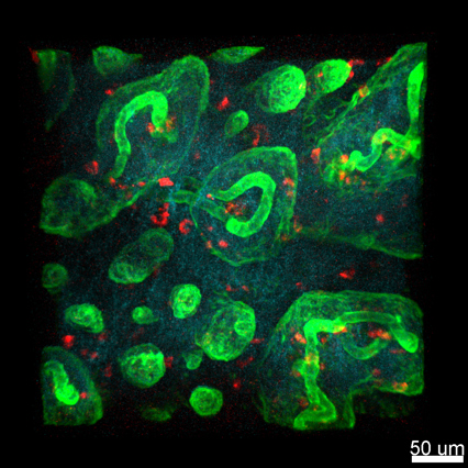 Afbeelding: bovenaanzicht van een huidbiopt waarin T cellen (rood) te zien zijn in de lederhuid (blauw) vlakbij vaatjes (groene buizen) en in de opperhuid (boven groene scheidslijn). De schaalbalk geeft 50 micrometer aan. (Afbeelding: Nature Immunology, Feline Dijkgraaf et al.)