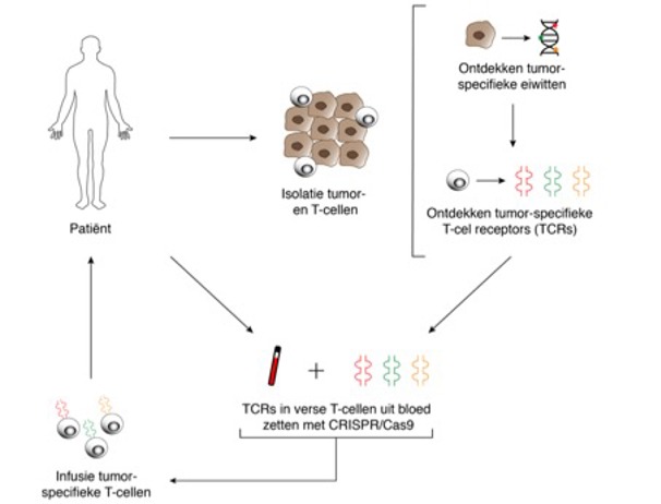 Internist-oncoloog John Haanen, onderzoeker Wouter Scheper en apotheker Joost van den Berg van het Antoni van Leeuwenhoek gaan nu een nieuwe T-cel therapie opzetten waarin de T-cellen van de patiënt een handje worden geholpen om de tumor te herkennen. Hiervoor hebben zij samen 1,5 miljoen euro subsidie ontvangen van ZonMw als onderdeel van het programma ‘Translationeel onderzoek 2’. In deze verkennende klinische studie ontvangen 5 patiënten met uitgezaaid melanoom ieder een op maat gemaakte set T-cellen die specifiek de tumor herkennen. Dit doen ze door per patiënt de unieke tumoreiwitten te achterhalen en hier vervolgens de bijpassende T-cel receptor - belangrijk voor tumorherkenning – bij te vinden en over te zetten op ‘verse’ T-cellen uit bloed van de patiënt, met behulp van de genetische techniek CRISPR/Cas9. Deze aangepaste T-cellen worden daarna via een infuus teruggegeven aan de patiënt waarna de cellen de tumor kunnen opsporen en opruimen. In deze studie wordt onderzocht of en hoe goed deze nieuwe T-cel therapie werkt voor deze groep patiënten en of deze behandeling veilig is.