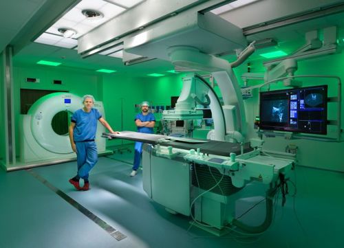 Waar patiënten voorheen tijdens een interventieradiologie behandeling verplaatst moesten worden voor een CT-scan, blijft de patiënt nu op één plek liggen. Het verplaatsen van de patiënt kost tijd en zorgt voor een veranderend beeld doordat de patiënt bijvoorbeeld anders is gaan liggen. In deze nieuwe OK zijn de CT-scanner en het interventie röntgenapparaat een geïntegreerd geheel. De CT-scanner staat op rails en schuift tijdens de operatie over de behandeltafel heen. De beelden van de CT-scanner en het röntgenapparaat worden zo samen gebruikt tijdens de behandeling. Tarik Baetens, interventieradioloog in het AVL: “Deze combinatie maakt het mogelijk om complexere behandelingen met nog grotere precisie uit te voeren ".