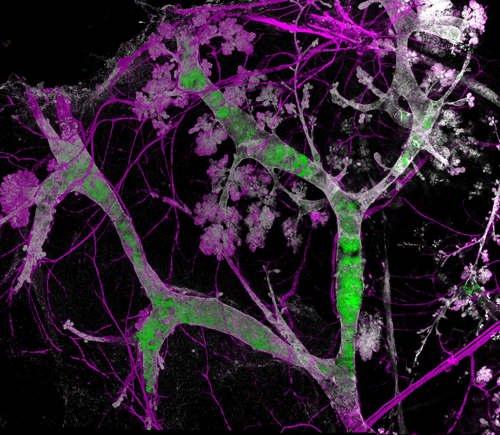 Vertakte boomstructuur van de borstklier waarin gemuteerde borststamcellen (in groen) zich beginnen te verspreiden. Uit deze gemuteerde borststamcellen kan uiteindelijk een borsttumor ontstaan.