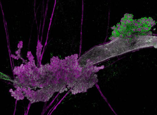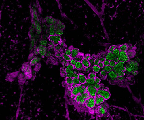 In dit klierbuisje van de borst is het allereerste begin van een borsttumor te zien. De groene cellen zijn cellen die beginnen te ontsporen. Uiteindelijk kan dit uitstulpseltje uitgroeien tot een borsttumor.