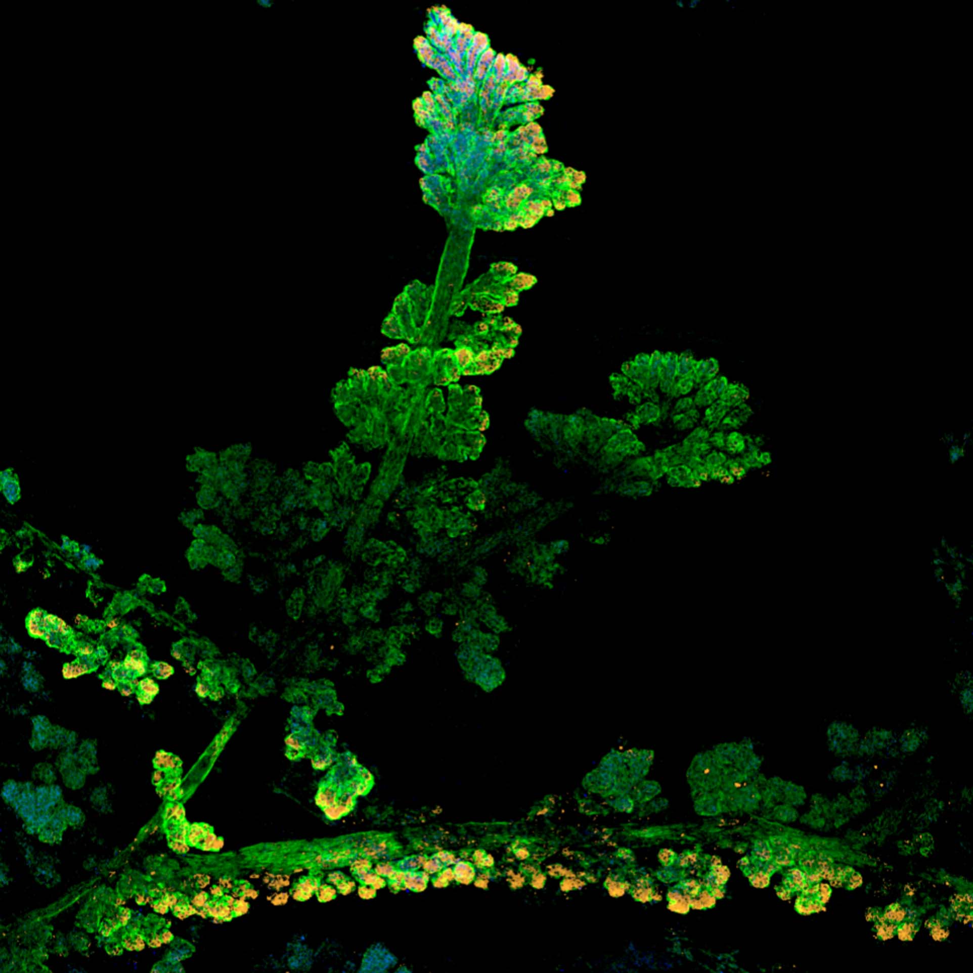 Deze bol is een organoïde: een in het lab gemaakt mini-orgaan. Deze bestaat uit gezonde muizen-dunnedarmcellen en darmkankercellen (groen). De kernen van alle cellen zijn blauwgekleurd en de rode ‘vlammen’ laten zien waar het gen Ly6a actief is. Bij geel overlappen kleuren elkaar; het is oorspronkelijk een 3D-plaatje. Bewerking: cartoon-effect