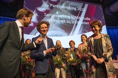 Donderdag 31 maart ontving de SONIA-studie de ZonMw Parel, een prijs die wordt uitgereikt aan bijzonder in het oog springende ZonMw-projecten. SONIA kreeg de Parel vanwege de zeer succesvolle voortgang van de studie, waarbij de intensieve samenwerking tussen alle betrokkenen geroemd werd. De SONIA-studie onderzoekt op welk moment in de behandeling van uitgezaaide borstkanker bepaalde medicijnen (zogenoemde CDK4/6-remmers) het beste kunnen worden toegepast.