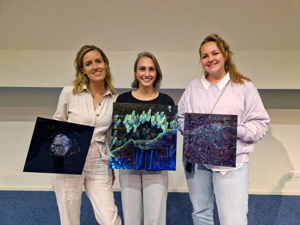 De derde plaats gaat naar Cellulaire caleidoscoop gemaakt door analist Iris Seignette van de afdeling Pathologie, begeleid door Erik Hooijberg en Gerrit Meijer. “Een kwaadaardige tumor bestaat niet alleen uit kankercellen, maar ook uit veel andere cellen zoals structuurcellen en cellen van het immuunsysteem”, zegt Iris, die onderzoekers ondersteunt en traint in beeldanalyse. “Het is van groot belang om te onderzoeken hoe al deze cellen zich gedragen en met elkaar communiceren. Onder de microscoop kunnen we dit visualiseren dankzij kunstmatige kleuren die we aan eiwitten hangen. Tot voor kort konden we zes tot acht eiwitten tegelijk in beeld brengen, maar met de nieuwe CODEX-technologie kunnen we tot 100 verschillende eiwitten kleuren in één enkel weefselplakje van ongeveer 3 micrometer dun. Deze technologie biedt zoveel meer context."