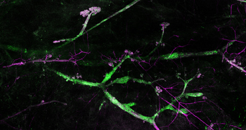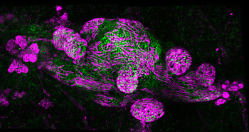 3D-microscopie laat twee verschillende groeipatronen zien die het risico van DCIS op borstkanker kunnen voorspellen. De DCIS-cellen zijn groen, de myoepitheelcellen van de melkgangen zijn magenta