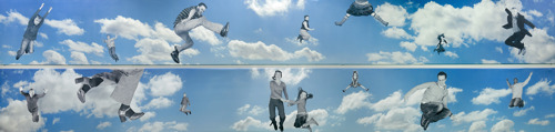In ‘Een zwevend moment’ staat beweging in de vorm van een sprong centraal. Voor dit werk maakte de kunstenaar eerst video-opnames van springende mensen. Vervolgens nam ze foto’s van verschillende fragmenten en voegde deze in een montage samen tot het huidige beeld. Nynke Deinema legde zo het zweefmoment in de sprong van verschillende mensen vast en plaatste ze in een wolkenlucht. De lucht versterkt het zweefmoment, het loskomen van de grond en het ontsnappen aan de zwaartekracht.