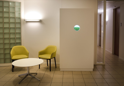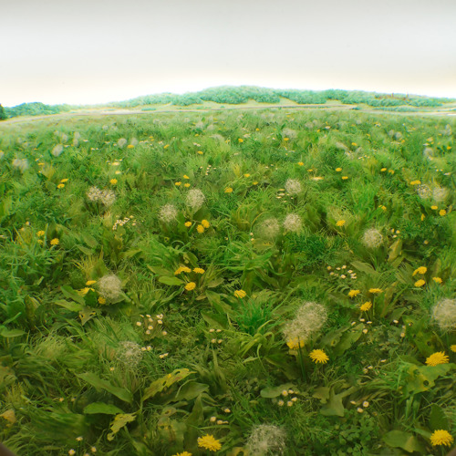 Patrick Jacobs creëert superrealistische werelden in miniatuurvorm. Je bekijkt zijn landschap ‘Dandelion Field’ door de ronde glazen lens in de wand van de kast. Van binnen uit belicht, lijkt het op een echte landschapsscène maar in feite zijn het driedimensionale constructies van historische diorama’s met verstopte lichtjes. Het werk refereert aan de vergezichten in de schilderijen van de Renaissance.